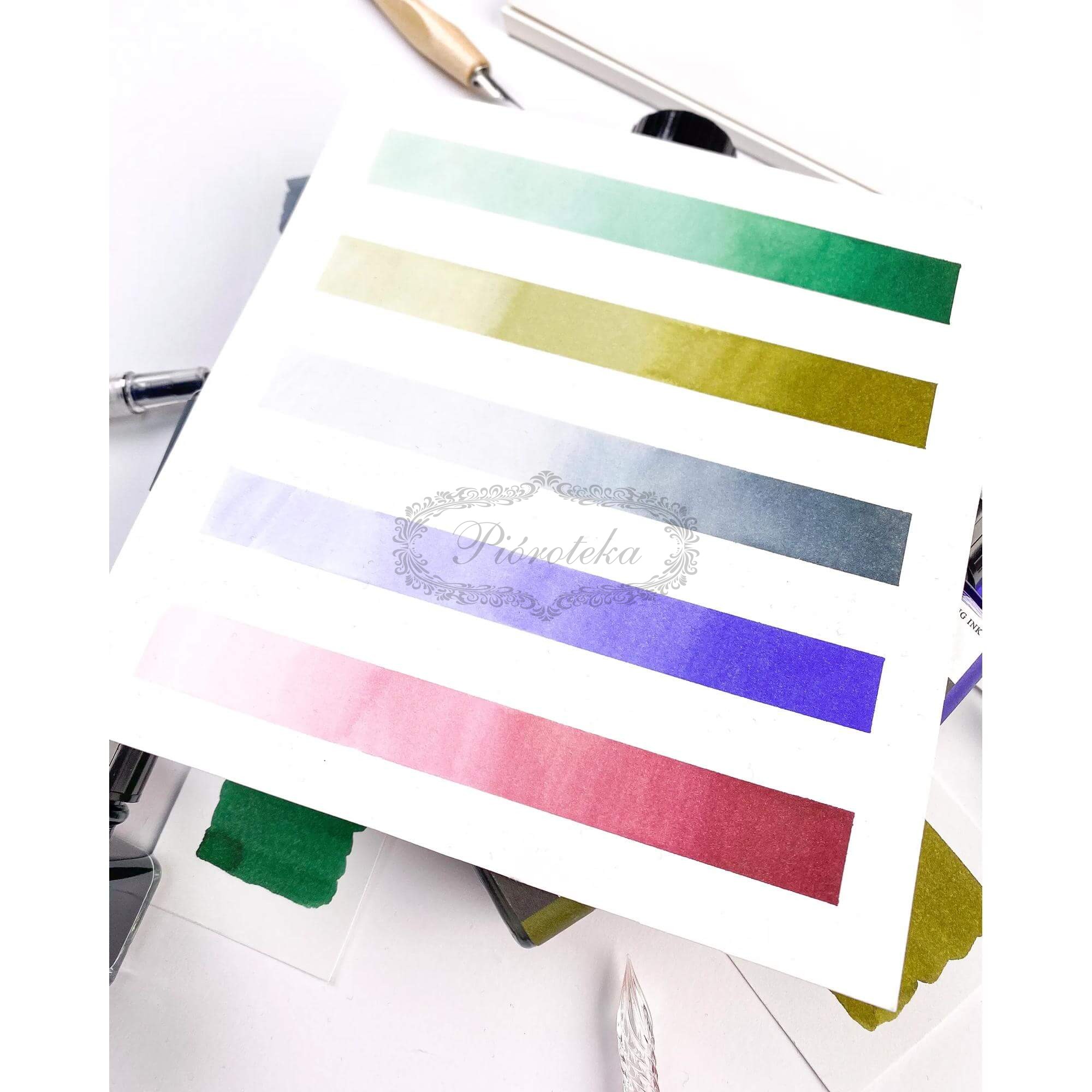 Do produkcji użyto wyłącznie naturalnych barwników na bazie wody, co gwarantuje neutralne pH i nietoksyczność atramentu, zapewniając bezpieczeństwo dla piór.