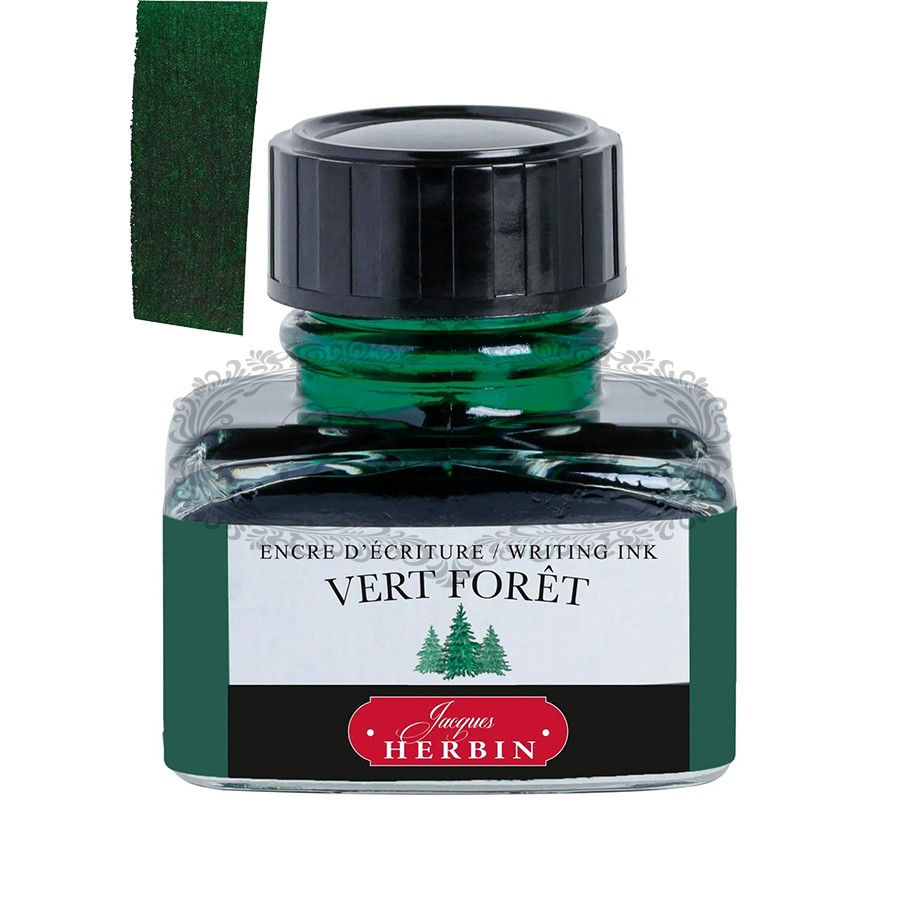 Vert Foret (Leśna Zieleń) to intensywny, głęboki odcień atramentu, inspirowany spokojem i bogactwem natury. Należy on do klasycznej gamy atramentów J. Herbin, najstarszej na świecie francuskiej marki piśmienniczej, założonej w Paryżu.