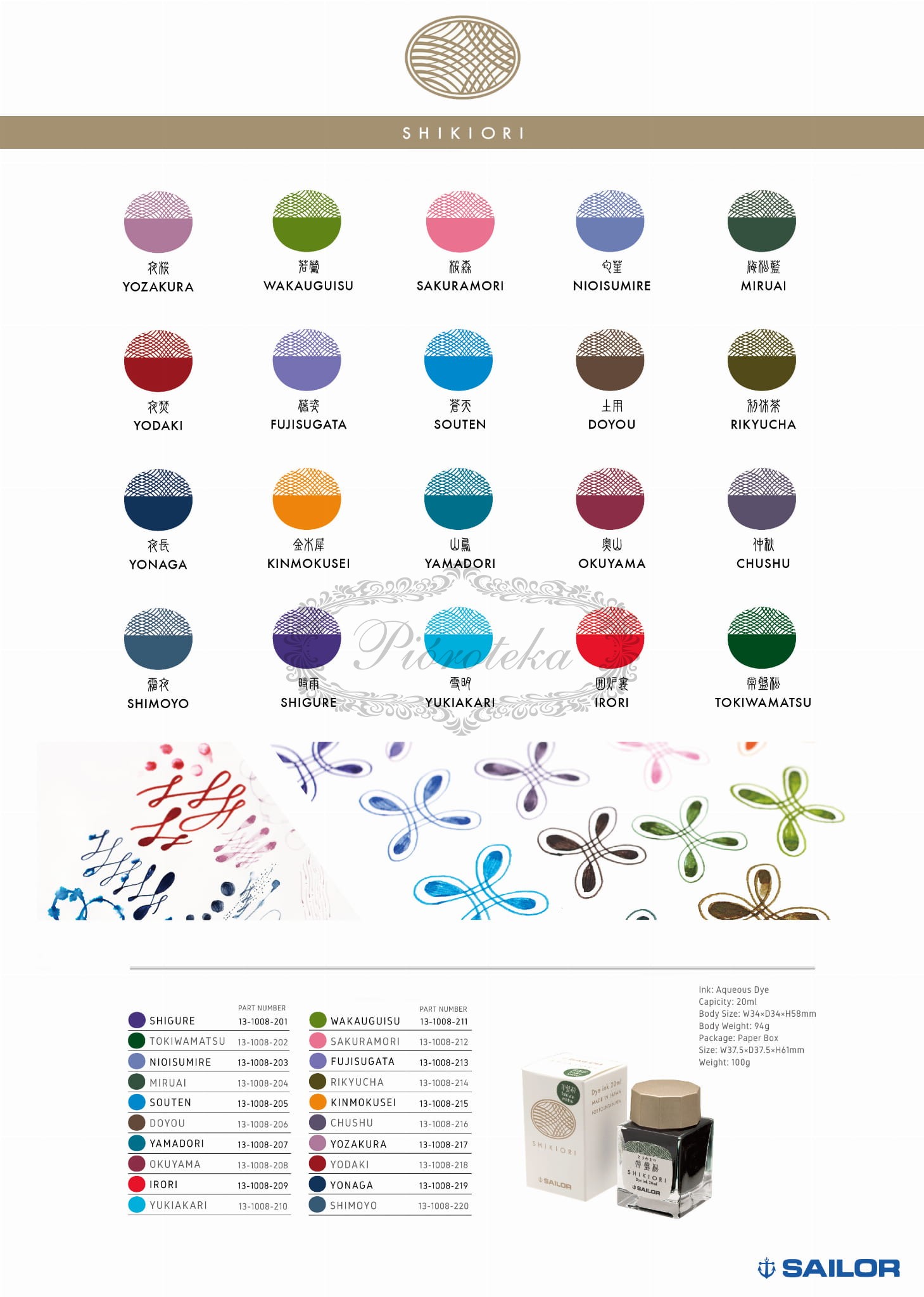 - Z serii "Cztery pory roku": Kolekcja Shikiori celebruje piękno zmieniających się pór roku w Japonii, a każda barwa jest hołdem dla natury. Atramenty tej serii to wysokiej jakości produkty stworzone z myślą o miłośnikach piór wiecznych.