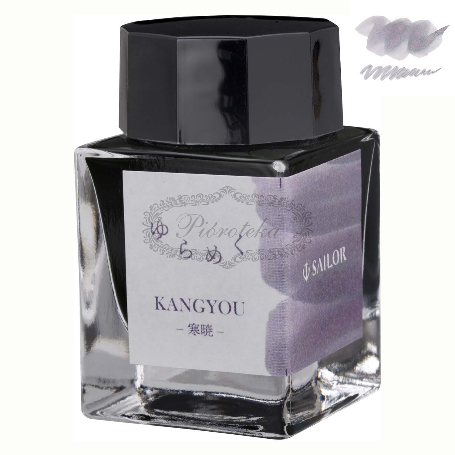 Atrament SAILOR YURAMEKU KANGYOU to esencja delikatności i zmienności. Nazwa "Kangyou" oznacza "zimno i czysto" w języku japońskim, a ten atrament wiernie oddaje tę ideę. Jego barwa subtelnie ewoluuje w zależności od rodzaju użytego papieru i czasu schnięcia. Choć jego bazowym odcieniem jest piękny błękit, przypominający czyste zimowe niebo, to na papierze potrafi ukazać zaskakujące przebłyski i cieniowania w różnych tonach, od szarawych po delikatne fiolety. Każde pociągnięcie pióra to nowa opowieść o kolorze, pełna głębi i tajemniczości.