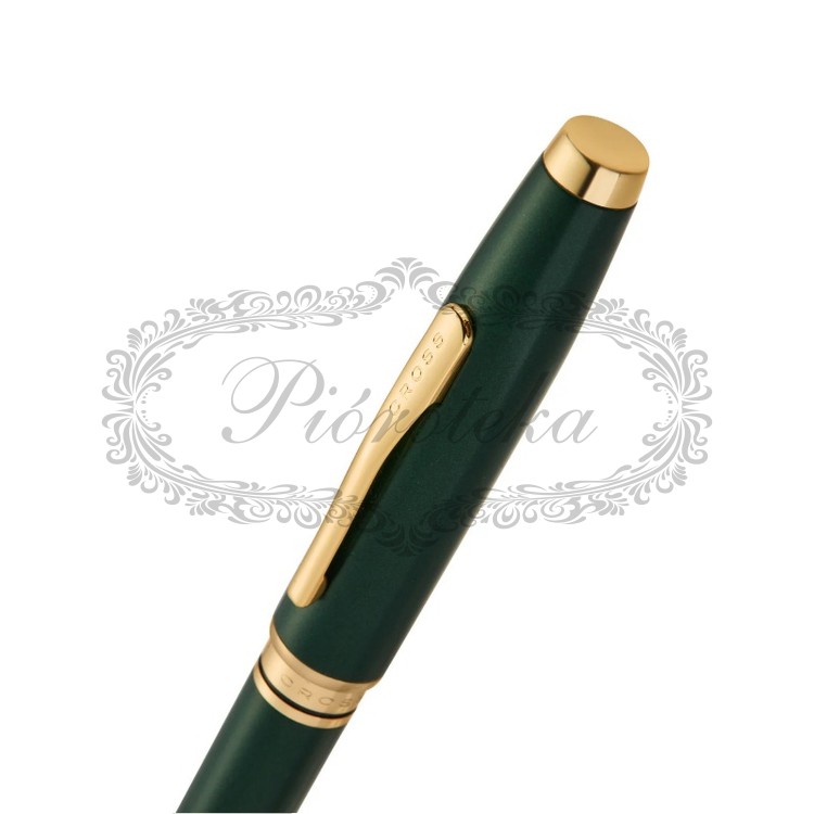 Korpus długopisu wykonany jest z trwałego mosiądzu, który pokryto lakierem o głębokim, zielonym odcieniu z delikatnym połyskiem. Wykończenia typu GT (Gold Trim), w tym charakterystyczny klip oraz pierścień z grawerem marki, zostały platerowane 23-karatowym złotem. Szczególną uwagę zwraca stożkowe zwieńczenie, jakie posiada skuwka, będące znakiem rozpoznawczym amerykańskiego designu marki Cross. Solidna konstrukcja sprawia, że długopis jest nie tylko piękny, ale i niezwykle wytrzymały.