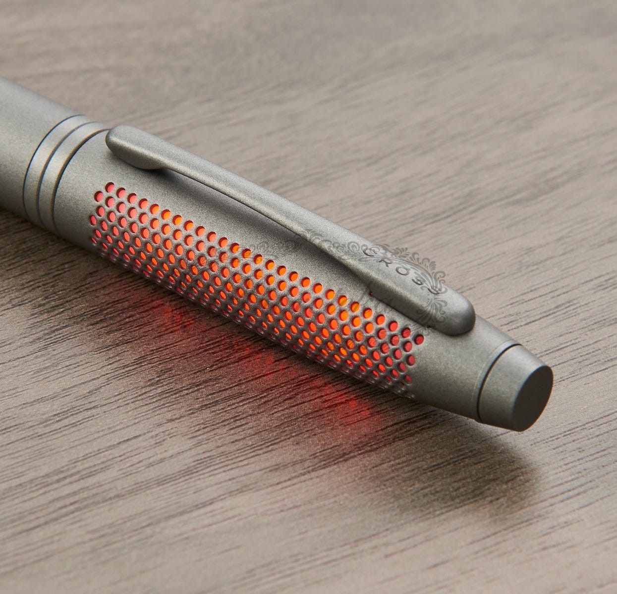 - Innowacyjne diody LED: Zintegrowane, kolorowe diody LED prześwitujące przez perforację na skuwce to prawdziwa innowacja. Możesz zmieniać ich kolor (trzy barwy) za pomocą szybkiego kliknięcia przycisku, aby dopasować długopis do swojego nastroju lub okoliczności. Światła są aktywowane przyciskiem z tyłu długopisu.