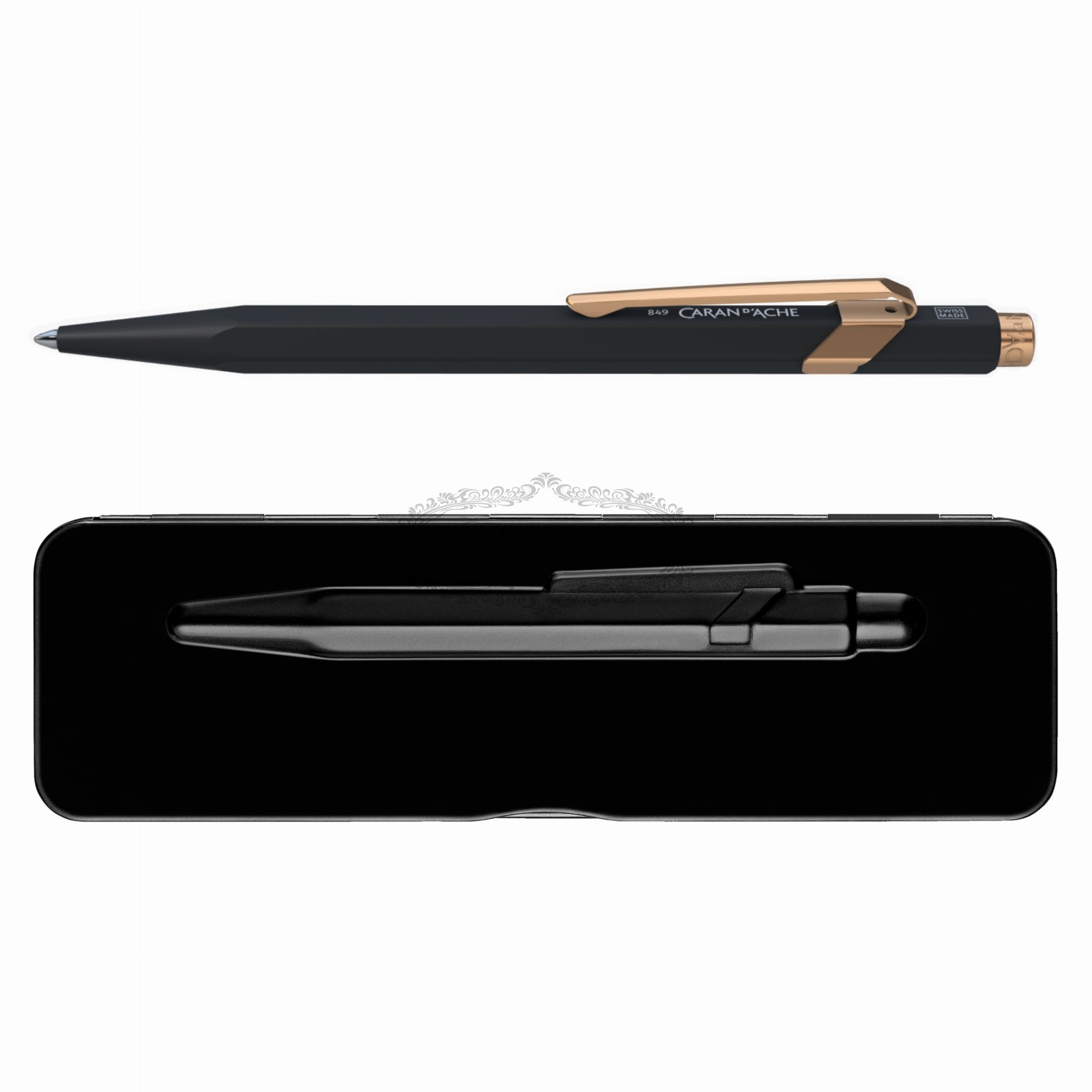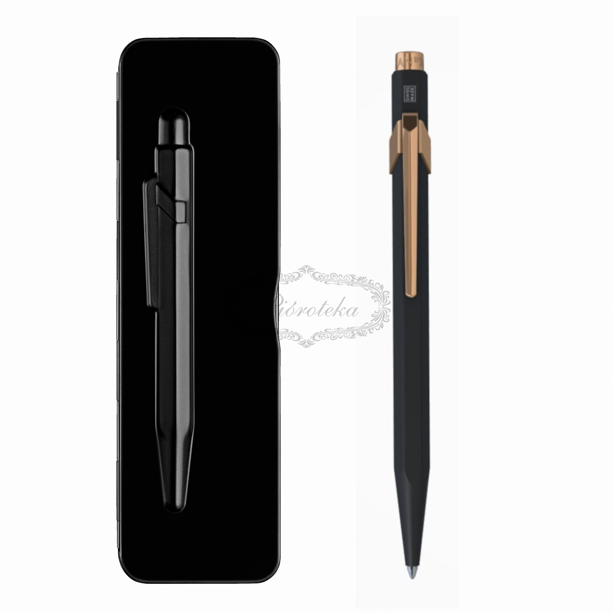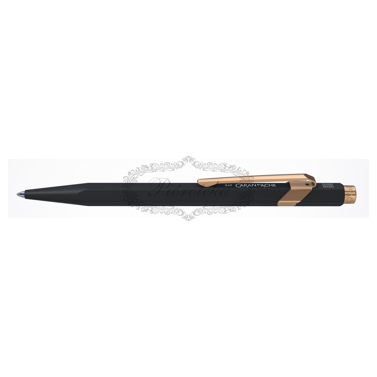 Odkryj kultowy długopis z serii 849, sygnowany przez renomowaną szwajcarską markę Caran d'Ache. Ten elegancki długopis łączy w sobie klasyczny design i nowoczesny styl. Sześciokątny korpus, wykonany z lekkiego i wytrzymałego aluminium, pokryty jest czarnym, matowym lakierem proszkowym, co nadaje mu subtelnej elegancji i ponadczasowego charakteru. Elementy wykończenia, takie jak klips i przycisk, są w kolorze różowego złota, dodając mu odrobinę luksusu.