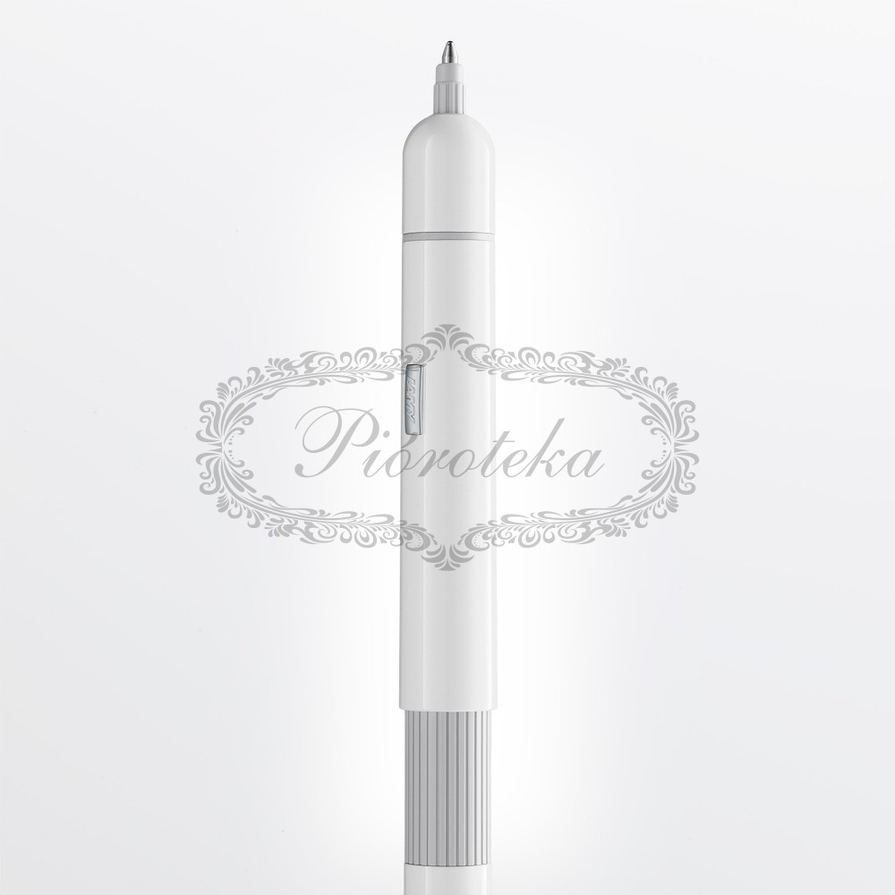 Korpus długopisu wykonano z litego mosiądzu, co zapewnia mu wyjątkową trwałość, solidny, a jednocześnie przyjemny w dłoni ciężar. Pokrycie go błyszczącym, białym lakierem nadaje mu nowoczesny i luksusowy wygląd, idealnie komponując się z chromowanymi detalami.