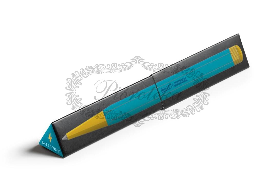 - Symbolika Bullet Journal: Na obrotowej końcówce długopisu wygrawerowana jest błyskawica, która jest charakterystycznym znakiem międzynarodowej społeczności Bullet Journal. Na korpusie znajduje się także napis "Drehgriffel" i "Bullet Journal".