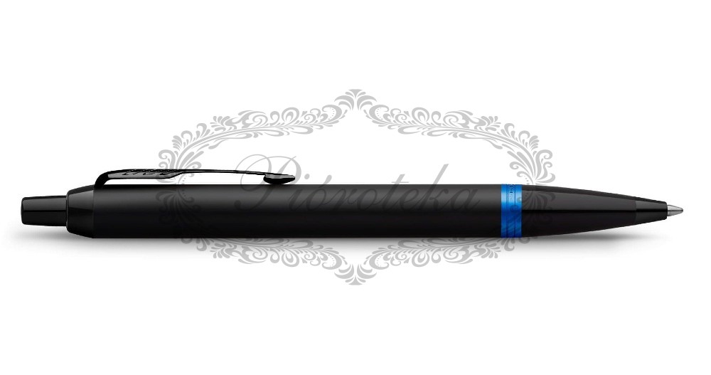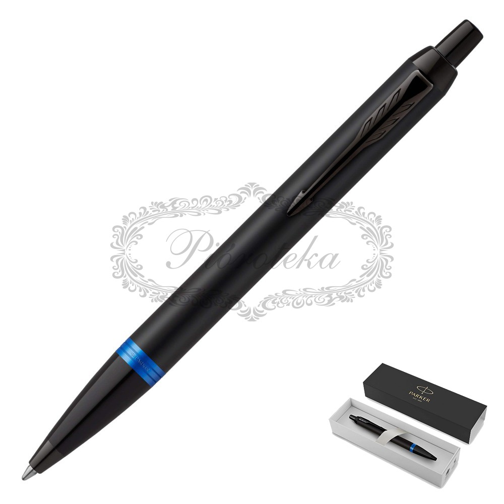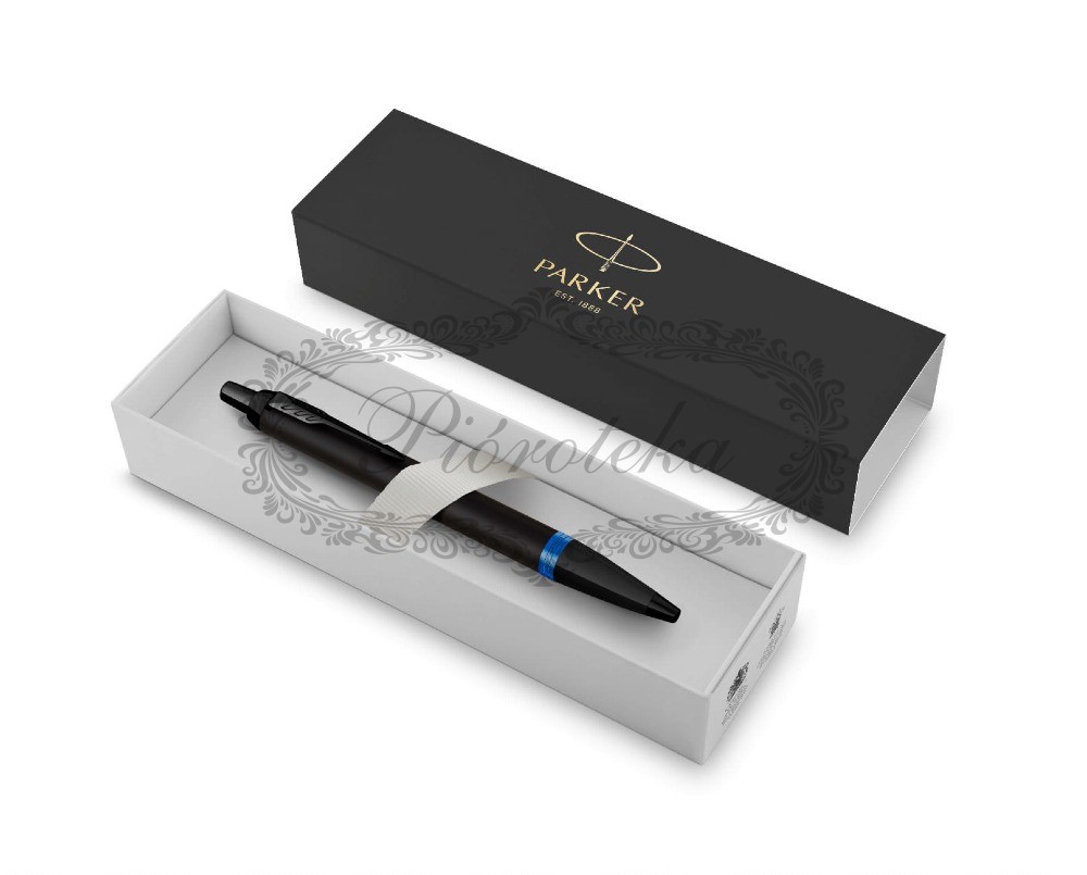 Model pochodzi z kolekcji Parker IM Professionals i charakteryzuje się matowym wykończeniem korpusu w kolorze czarnym z błękitnymi pierścieniami. System wysuwania wkładu jest przyciskowy. Długość instrumentu wynosi 13,6 cm, a jego średnica to 11 mm. Całość waży 23 g, co zapewnia stabilność i pewność chwytu. Produkt oferuje możliwość wykonania grawerowania, co pozwala na personalizację instrumentu.