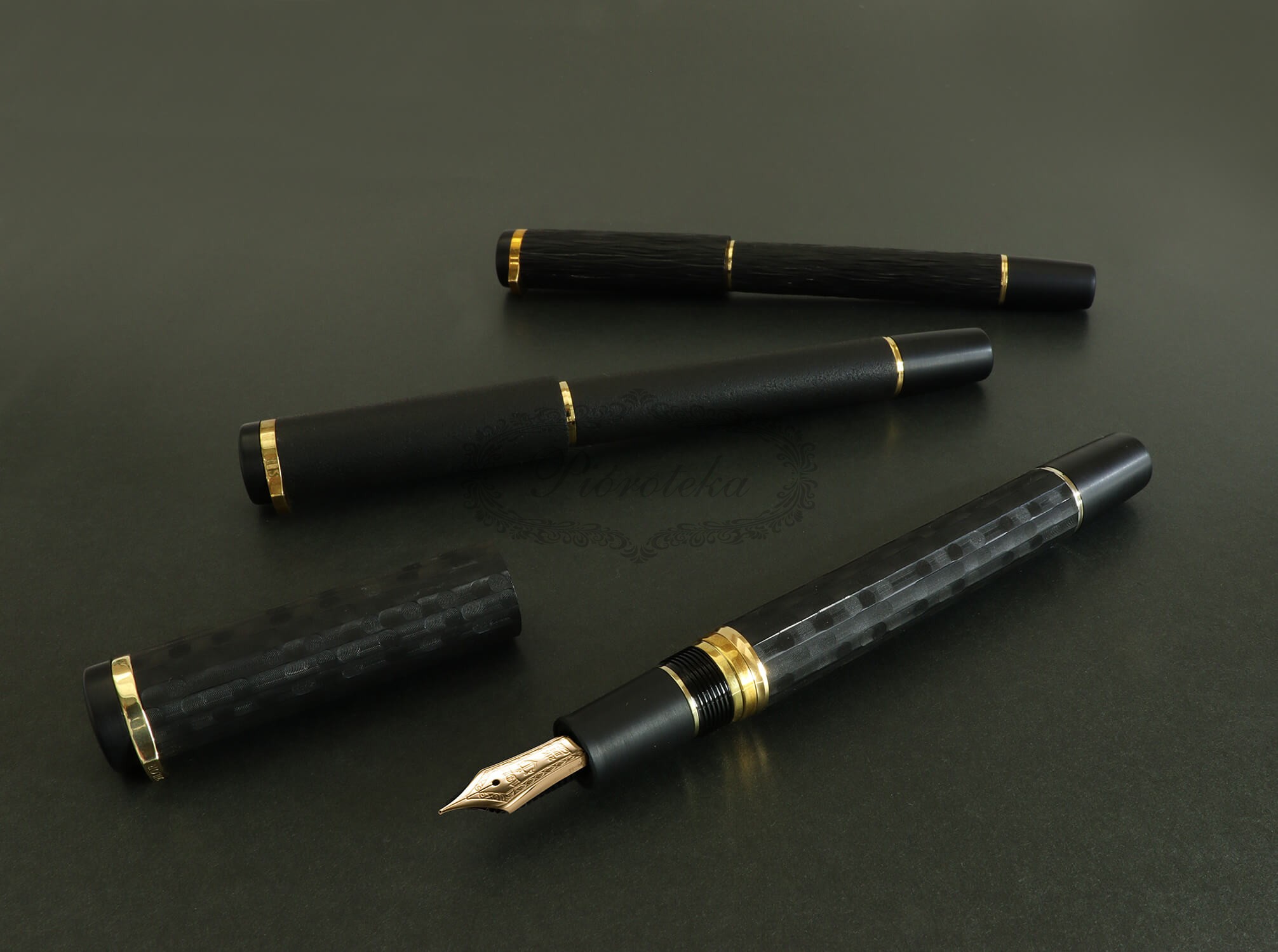 Diamentowy wzór: Ebonit zdobi złożona diamentowa rzeźba, której liczne warstwy okręgów i krawędzi zmieniają swój wygląd w zależności od kąta padania światła. Efekt ten przypomina blask i odbicia rozproszonego światła na nocnej drodze, nadając pióru niezwykłą głębię i dynamikę.