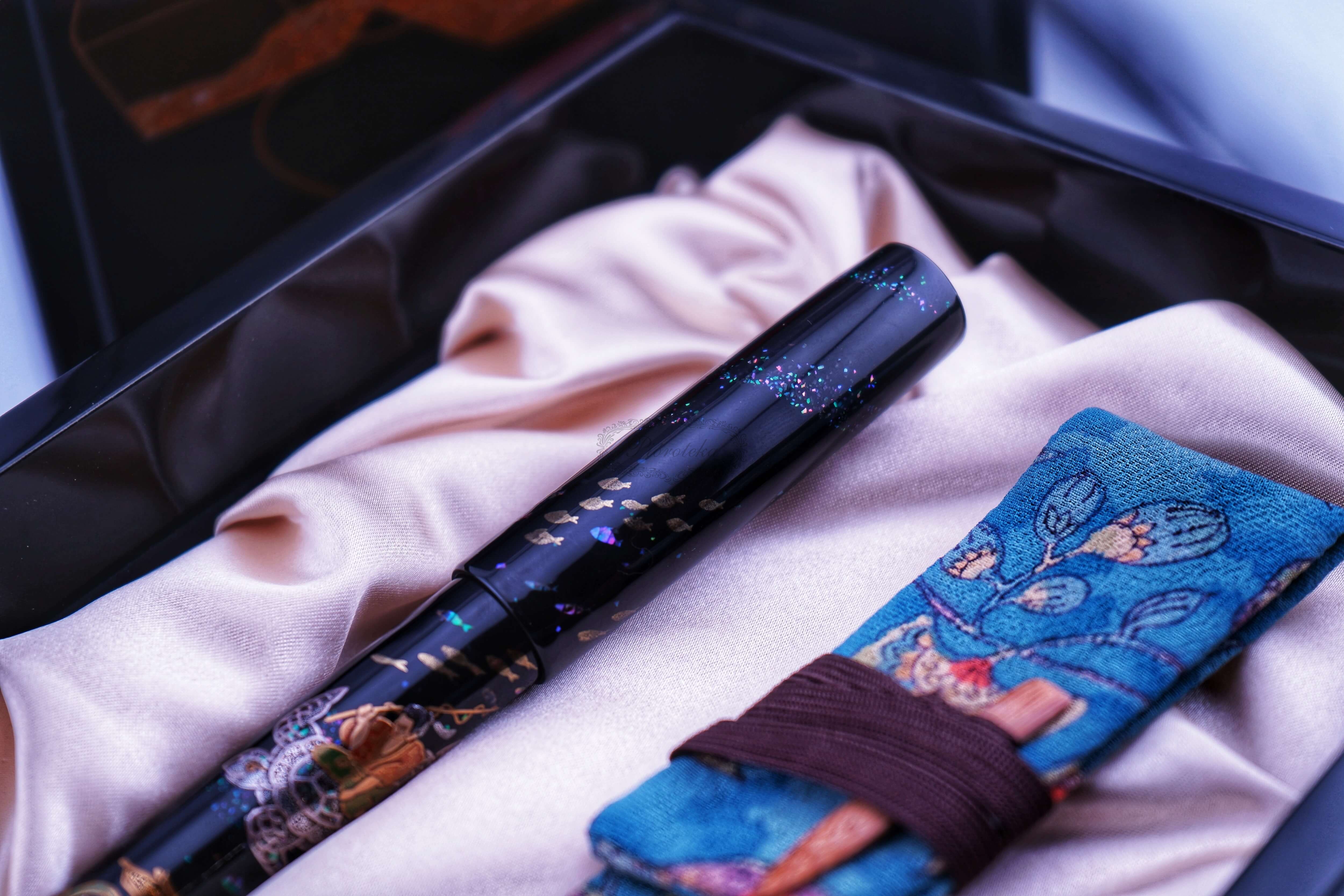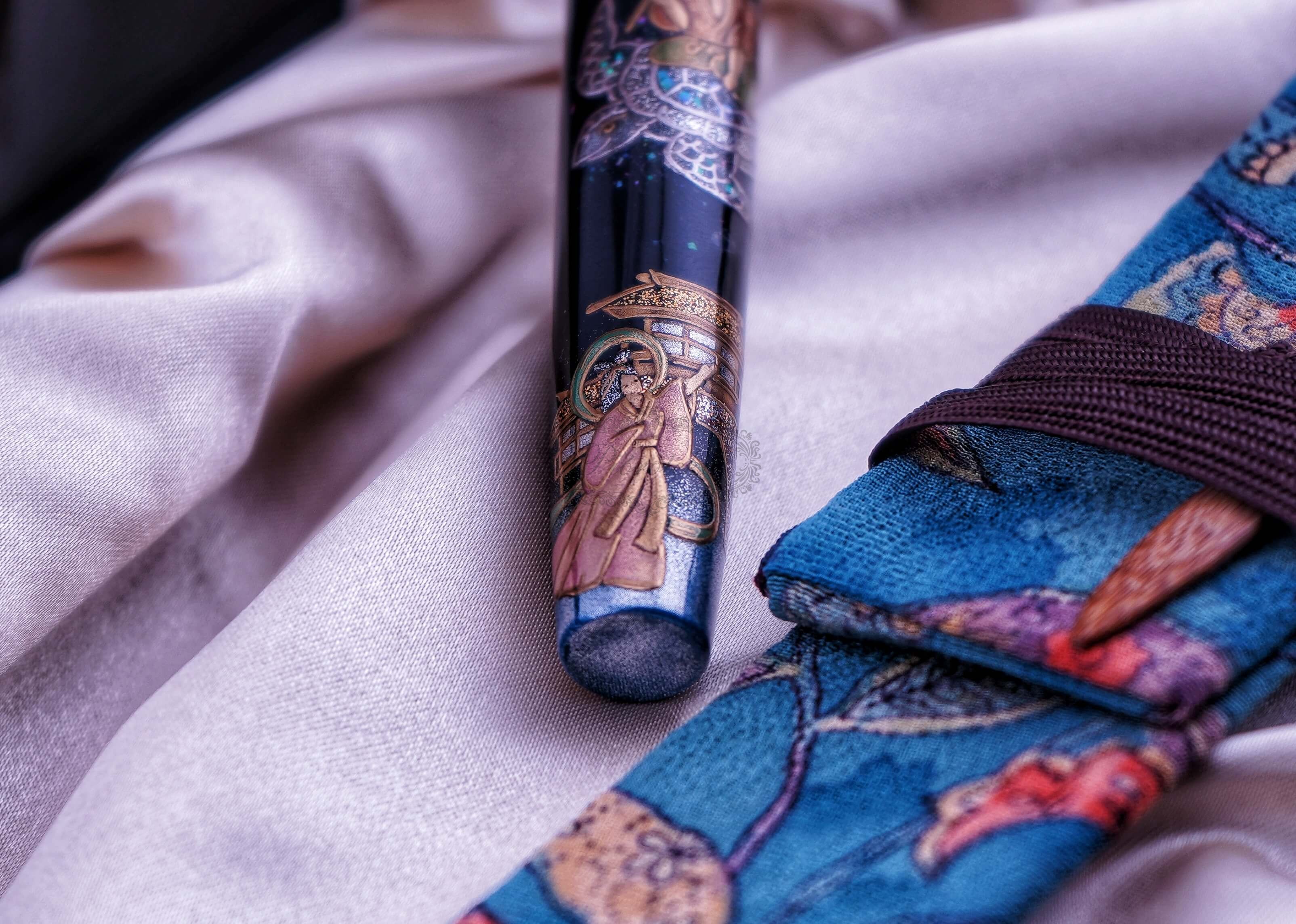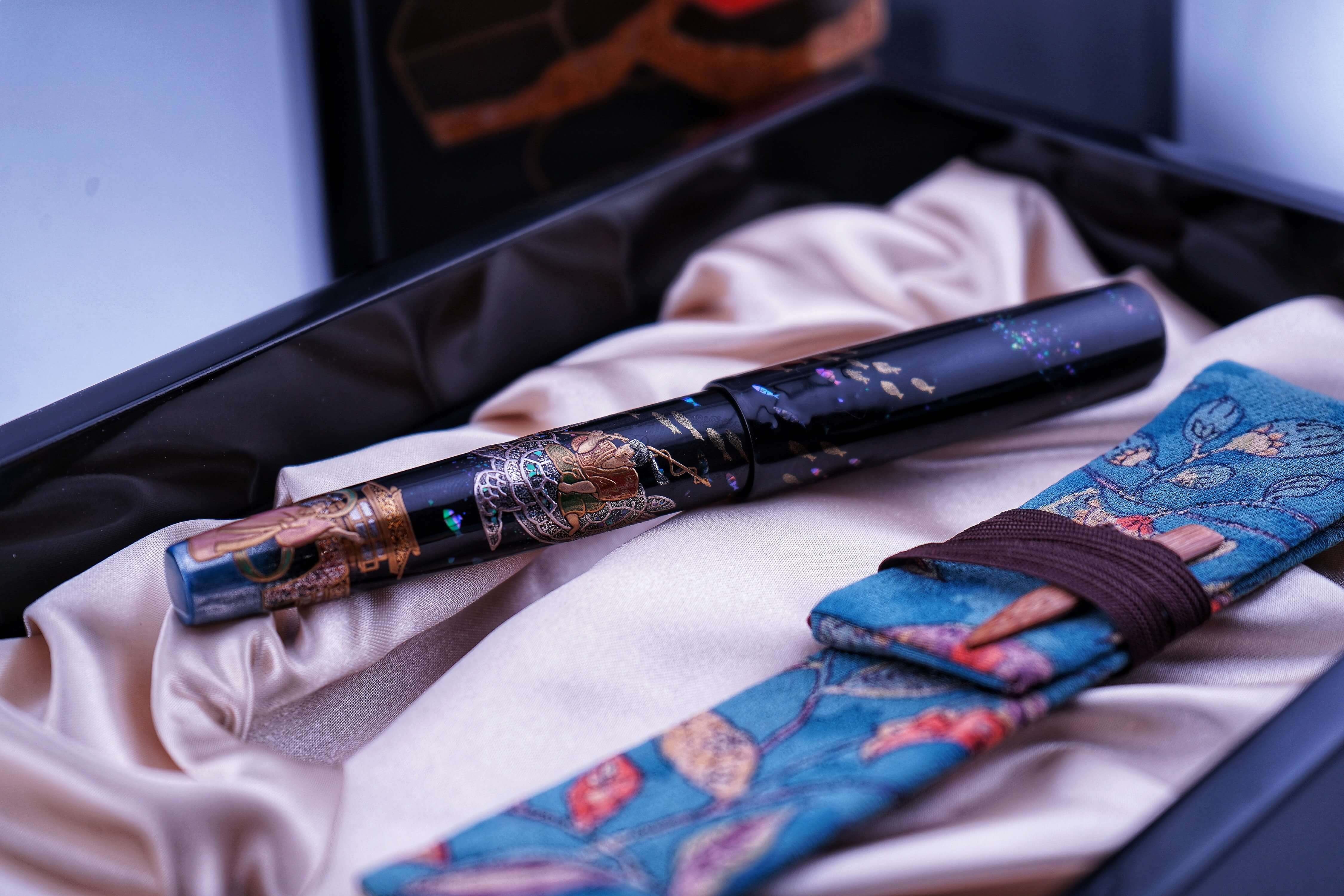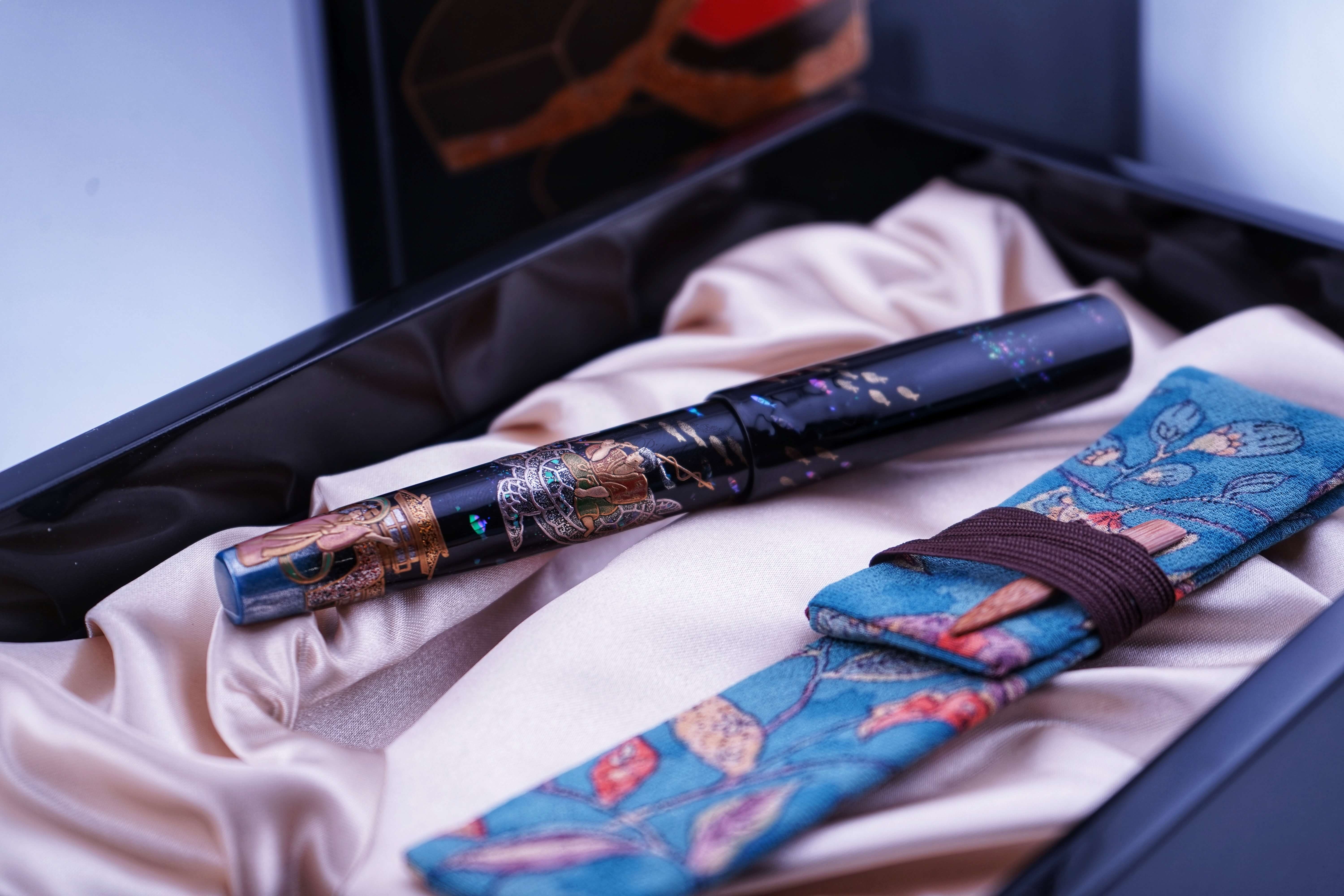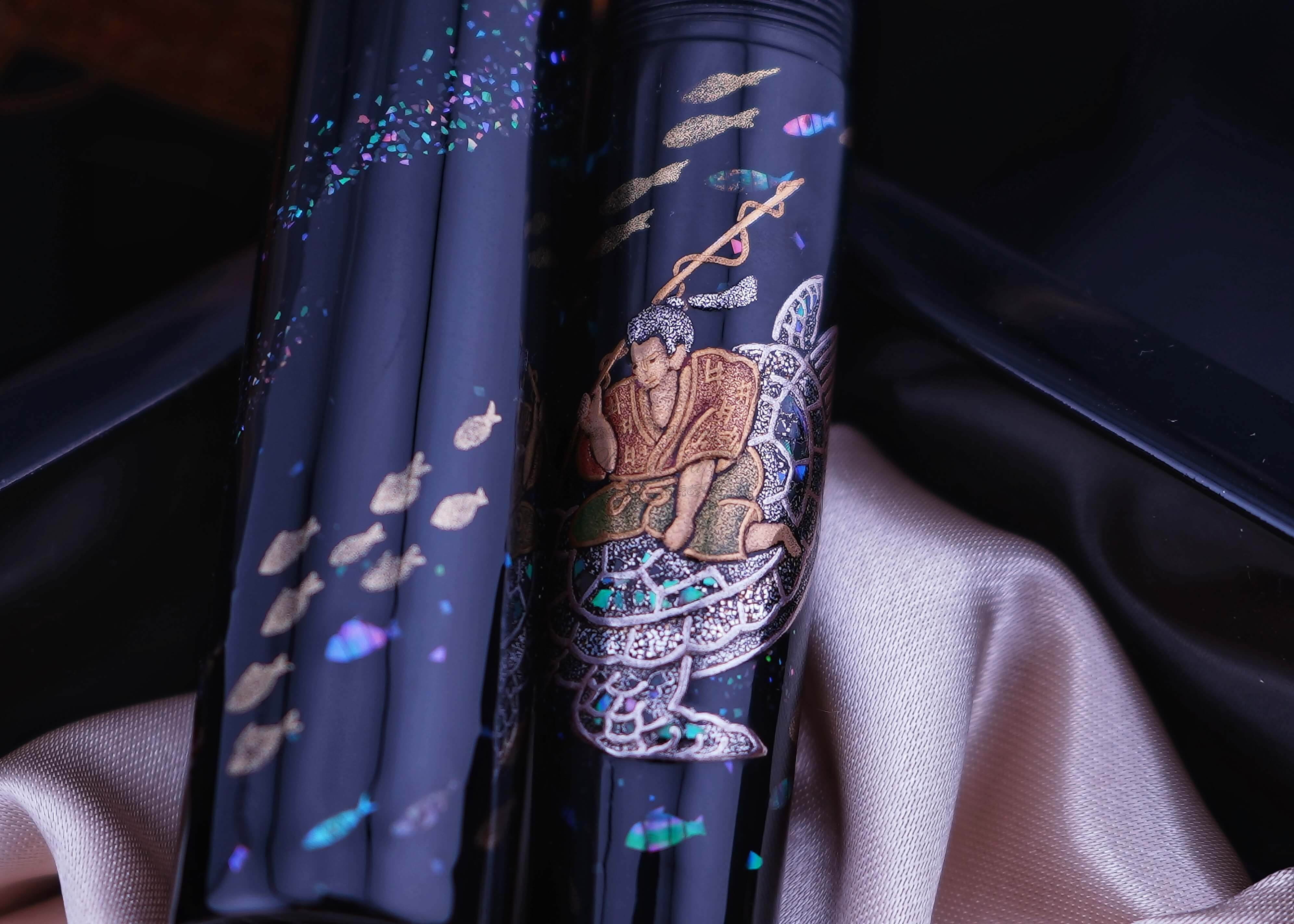 Temat Urashima Taro: Zdobienia na piórze i luksusowym, lakierowanym pudełku (widocznym na zdjęciach) przedstawiają kluczowe elementy opowieści: żółwia (często symbol długowieczności, znanego jako Minogame) oraz magiczną Tamatebako (Szkatułę Skarbów), którą Urashima otrzymał w podarunku.