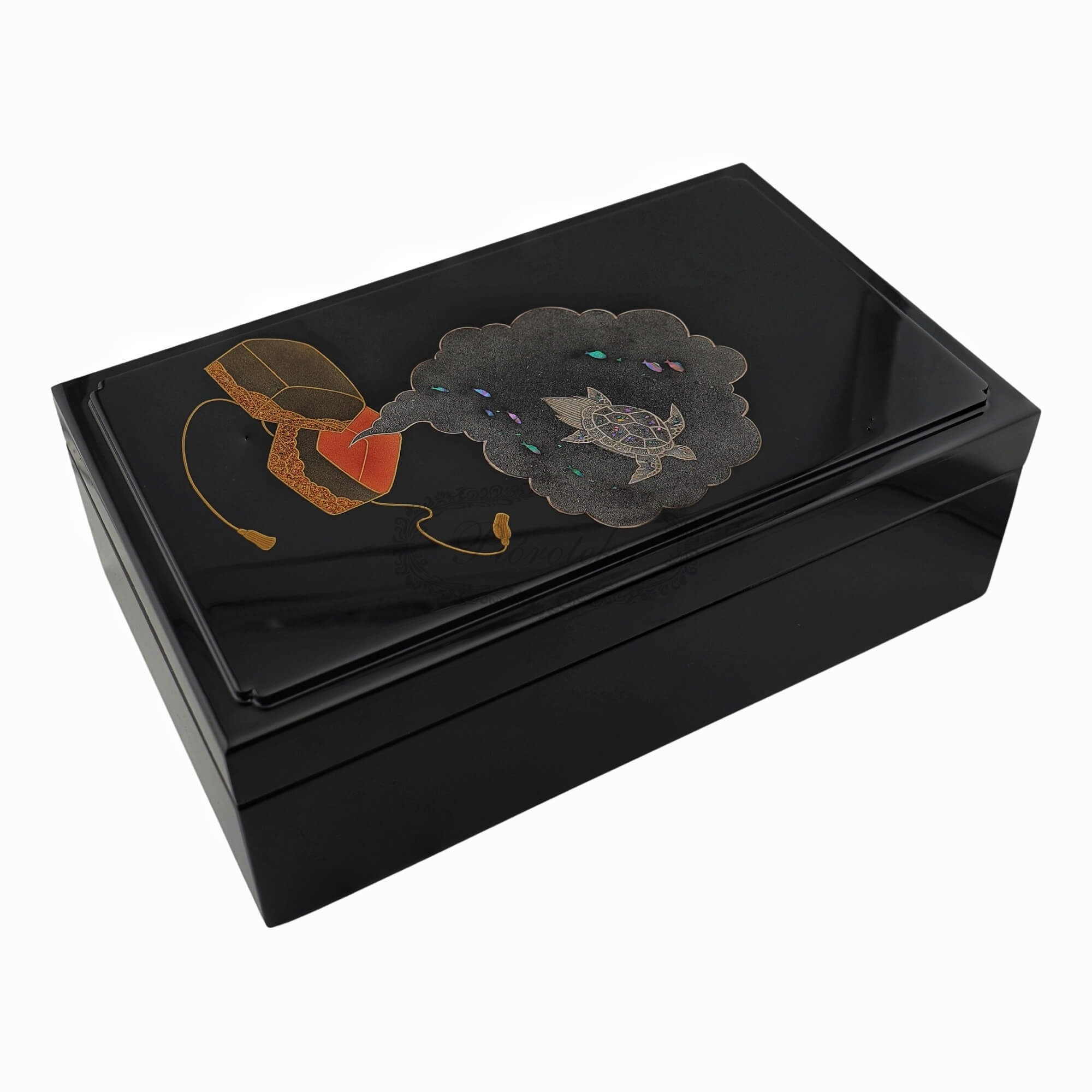 Technika Maki-e i Raden: Czarne, głębokie wykończenie z japońskiego lakieru Urushi stanowi idealne tło dla precyzyjnego złocenia techniką Maki-e (malowanie lakierem i posypywanie metalicznym proszkiem, często złotym) oraz spektakularnej techniki Raden, polegającej na inkrustacji maleńkimi kawałkami masy perłowej (widocznej jako migoczące punkty, przypominające gwiazdy lub podwodne skarby).