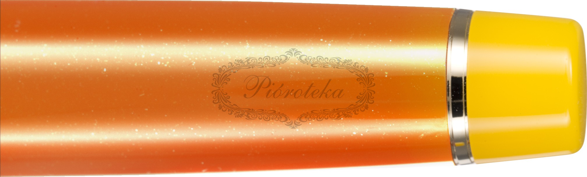 To pióro przyciąga wzrok unikalną grą barw i tekstur. Korpus wykonano z półtransparentnej żywicy w kolorze nasyconego pomarańczu, w której zatopiono subtelne, lśniące drobinki (glitter), imitujące refleksy światła na falach. Kontrastująca, żółta skuwka oraz zakończenie korpusu symbolizują tarczę księżyca w pełni. Całość kompozycji dopełniają złote detale – szeroki pierścień skuwki oraz klips – które nadają pióru ciepłego, królewskiego blasku.